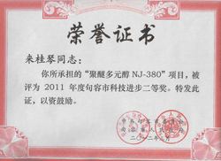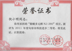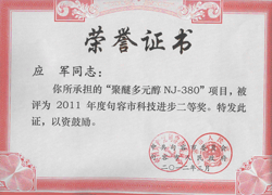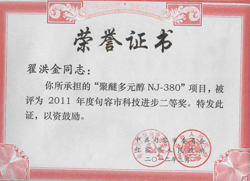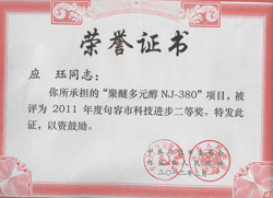 2011年度我公司研制的“聚醚多元醇NJ-380”項(xiàng)目獲句容市科技進(jìn)步二等獎(jiǎng)。